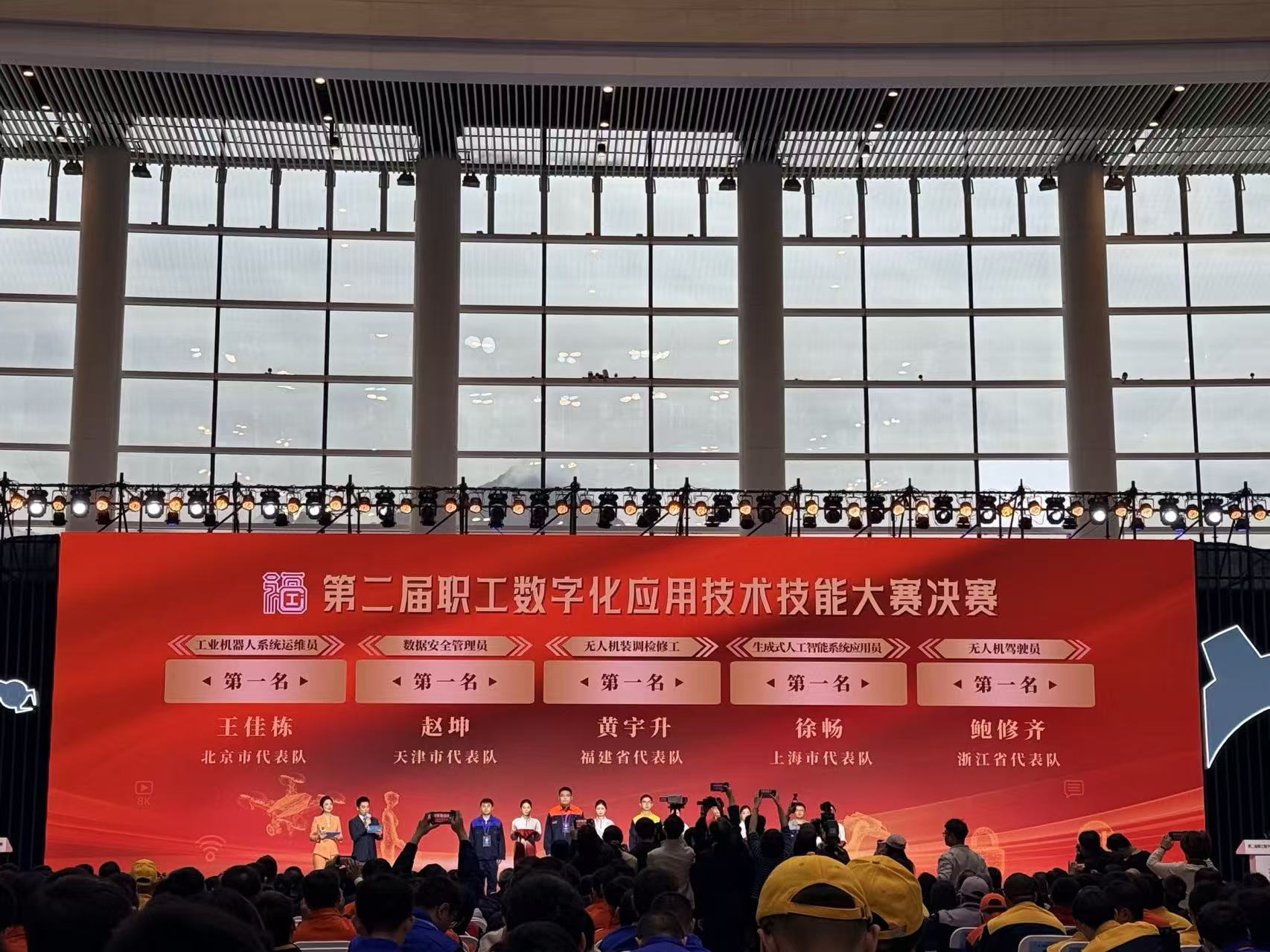 经过3天的激烈角逐,北京市代表队的王佳栋获得工业机器人系统运维员工种决赛第一名,天津市代表队的赵坤获得数据安全管理员工种决赛第一名,福建省代表队的黄宇升获得无人机装调检修工工种决赛第一名,福建省代表队获得团体总分第一名。