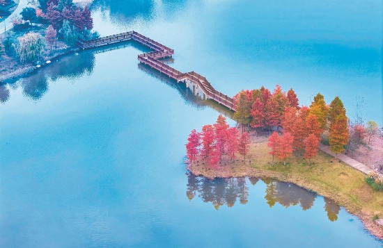 11月13日,初冬时节的朔西湖景区,层林尽染,湖水潋滟,绘就一幅绚丽迷人生态画卷。朔西湖位于淮北市杜集区朔里镇,前身是煤矿采煤沉陷形成的塌陷区,当地积极开展生态修复,打造集生态湿地与文旅功能于一体的综合体,成为一处受群众青睐的“网红打卡地”。(记者 李博 摄)