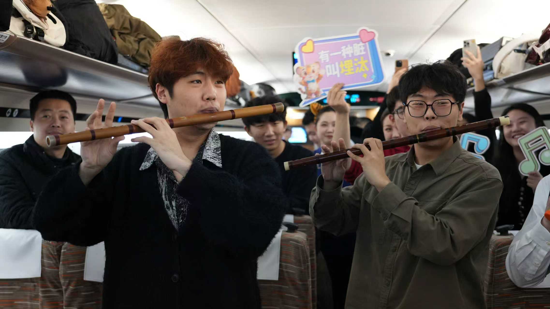 G917次列车连接北京朝阳至哈尔滨西,全程1235公里,运行时间仅4小时35分,成为南方游客“找北游”的主要交通工具。哈尔滨音乐学院青年民族乐团利用乘车赴京参加演出契机,在返程途中开展冰雪主题民俗音乐会,用二胡、唢呐、笛子等民族乐器,演奏《春江花月夜》等多首经典曲目,传播音乐文化,唱响中国旋律。