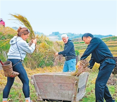 近日,广西壮族自治区桂林市龙胜各族自治县开始收割稻谷,众多国内外游客走进龙脊梯田,体验稻谷收割的乐趣。据统计,今年1至9月,龙胜累计接待游客1083.7万人次,同比增长9.25%。其中,入境游客33.1万人次,同比增长67.27%。图为比利时游客在龙胜的平安壮寨体验打谷子。