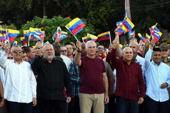 10月17日,5万多古巴民众聚集在首都哈瓦那总统大道的西蒙·玻利瓦尔雕像前,抗议美国军事威胁委内瑞拉,表达对委内瑞拉人民和政府的坚定支持。古共中央第一书记、古巴国家主席迪亚斯-卡内尔(前左三)等古巴党政领导人以及委内瑞拉全国代表大会第一副主席佩德罗·因方特(前右一)出席集会。新华社发(华金·埃尔南德斯摄)