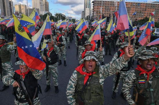 9月23日,在委内瑞拉首都加拉加斯,民兵组织成员挥舞委内瑞拉国旗参加游行。新华社发(马科斯·萨尔加多摄)