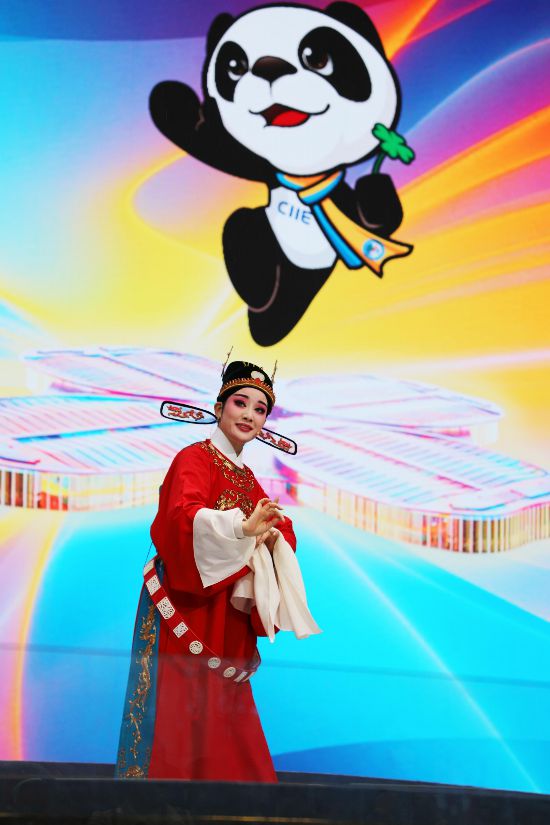 11月6日,来自安徽省黄梅戏剧院的青年演员登上国家会展中心(上海)中央广场舞台,演唱黄梅戏《女驸马》。