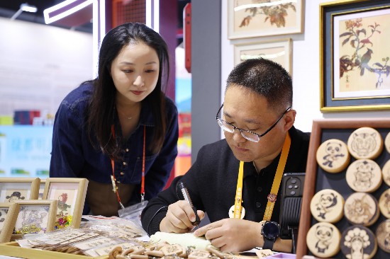 11月5日,进博会安徽展区,非遗代表性传承人(右一)向参观人员展示淮南烙画技艺。