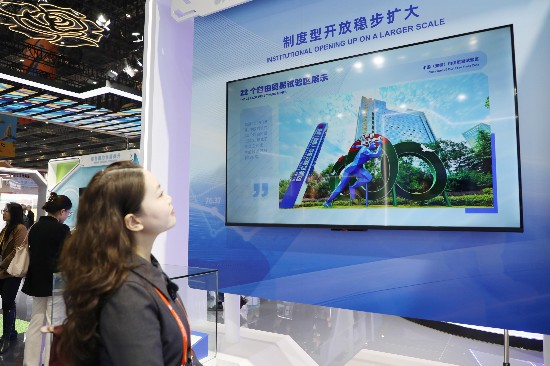 11月7日,观众在进博会中国馆观看中国(安徽)自由贸易试验区图文展。