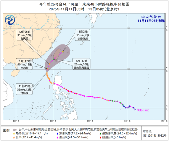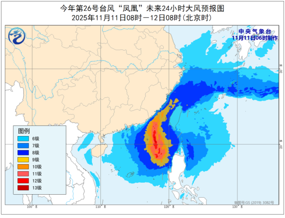 预计,11月11日至11月13日,受台风“凤凰”影响,南海东北部和中东部、台湾海峡、巴士海峡、东海南部风力可达9-11级,阵风12-13级,台风“凤凰”中心经过的附近海域风力12-13级,阵风14-15级;福建东部、台湾岛、浙江中东部等地有大到暴雨,局地大暴雨。