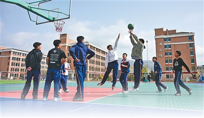在青海西宁市果洛西宁民族中学,学生在打篮球。 |