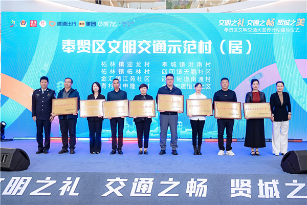 在授旗环节,柘林镇迎龙村等8家在文明交通管理与宣传中表现突出的村居被授予“奉贤区文明交通示范村(居)”称号。迎龙村代表现场分享了“两站两员”建设和“网格化交通安全宣传”的实践经验,并发出了践行文明交通的倡议。
